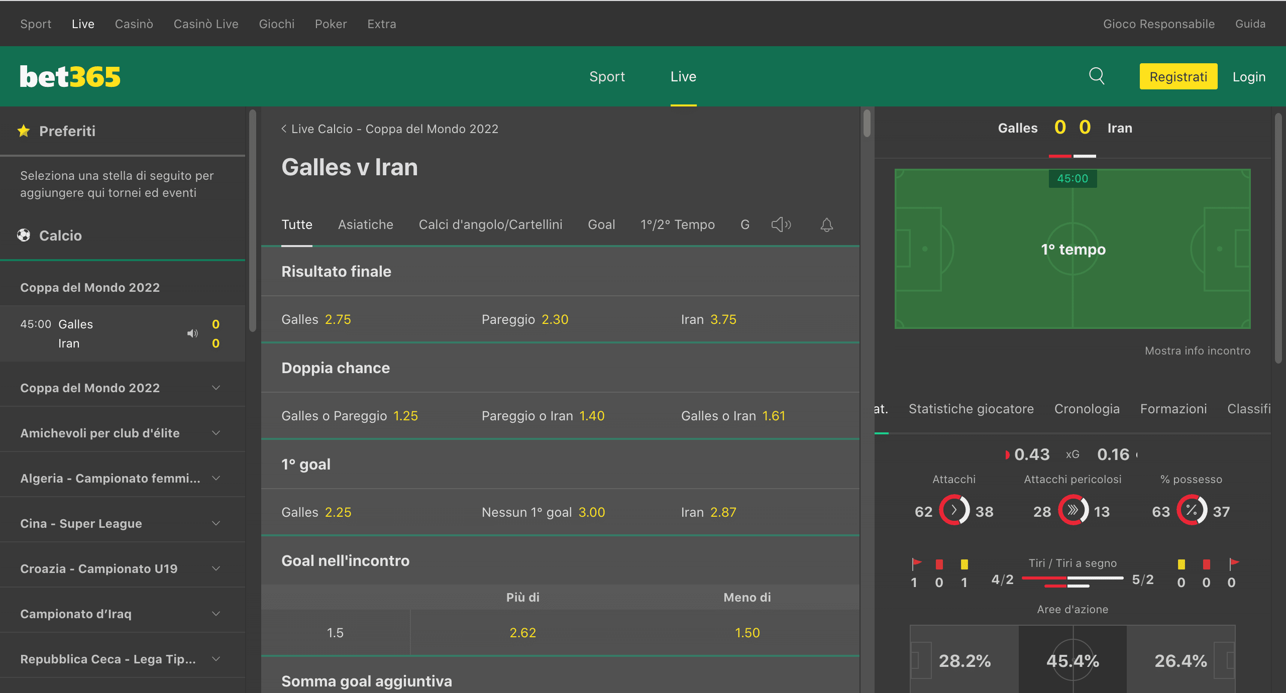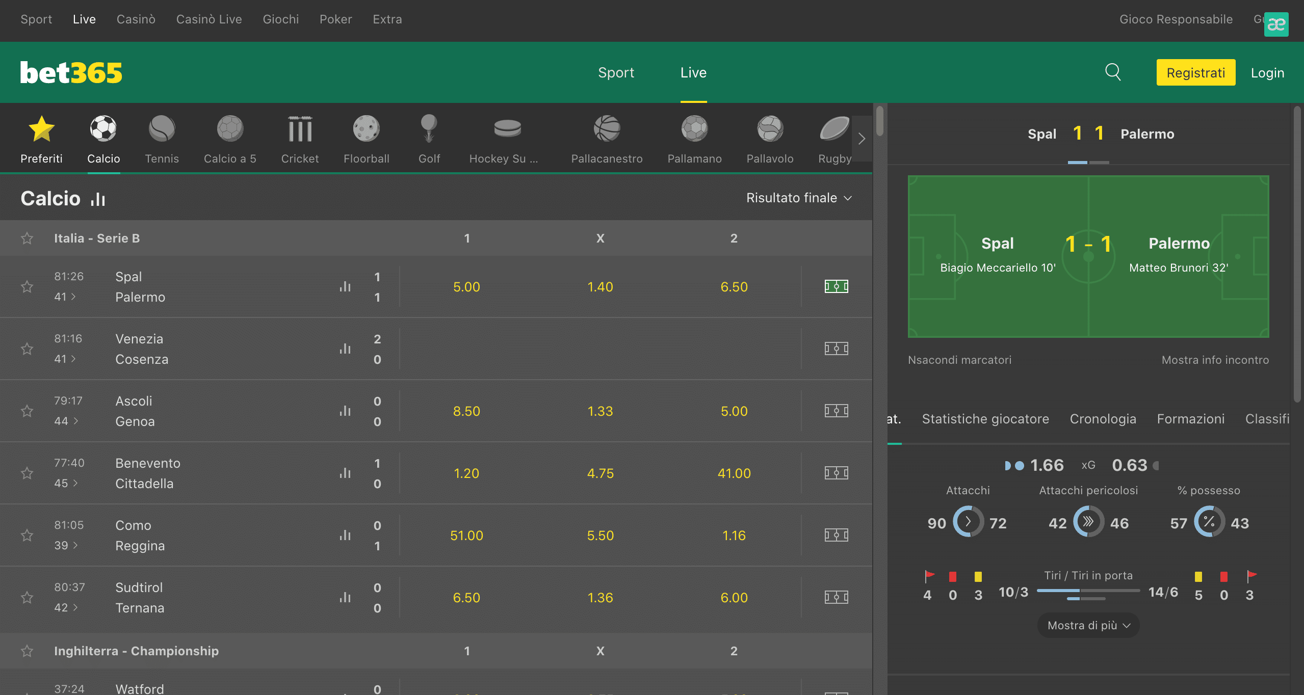 Le opzioni di scommessa in tempo reale su Bet365 comprendono scommesse sull’esito finale, il risultato parziale, il prossimo gol e molto altro ancora.