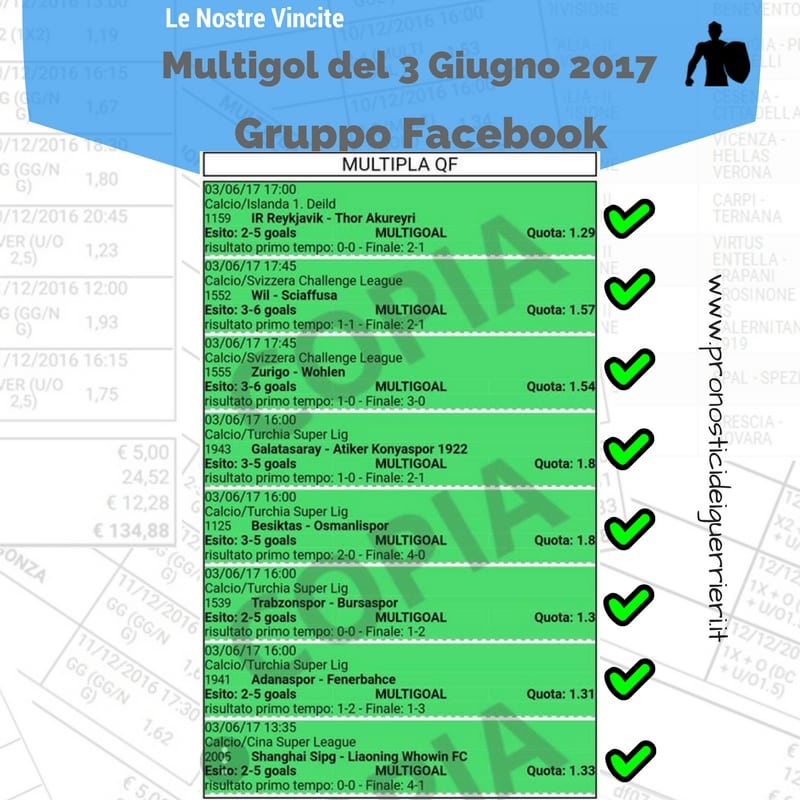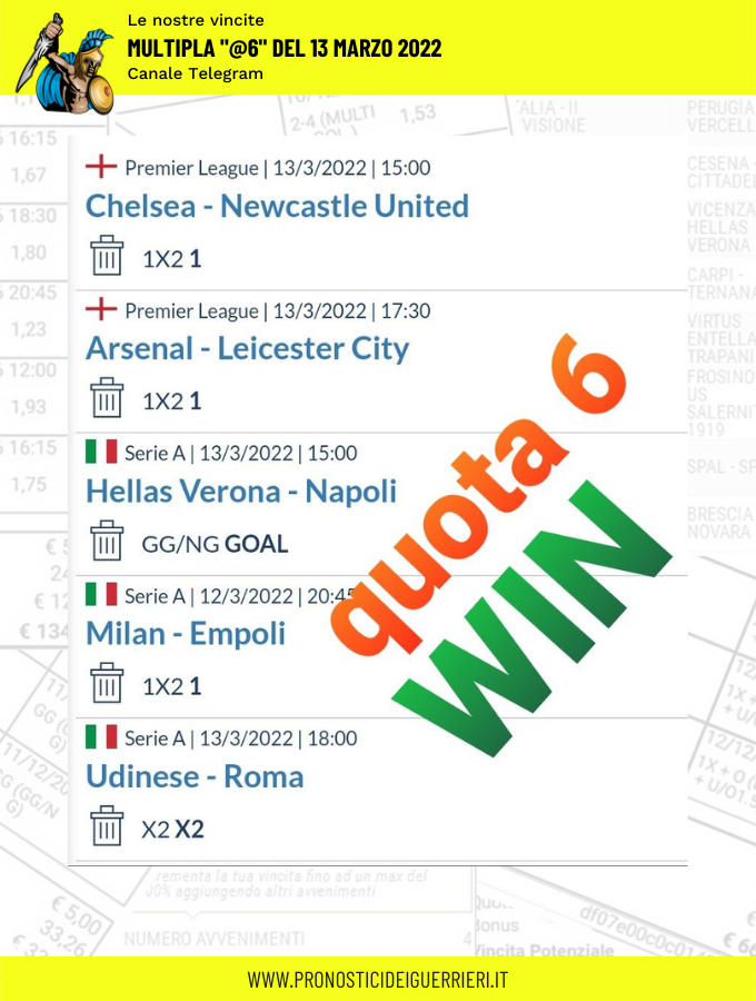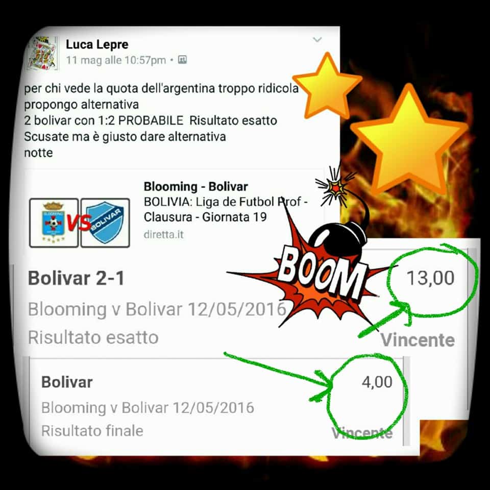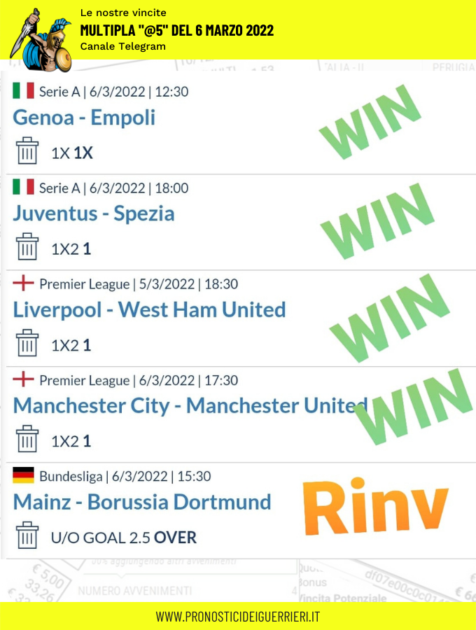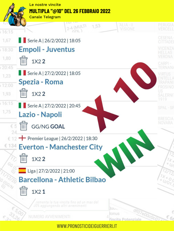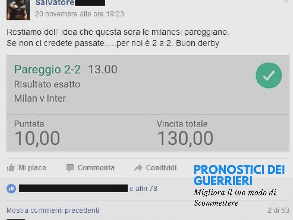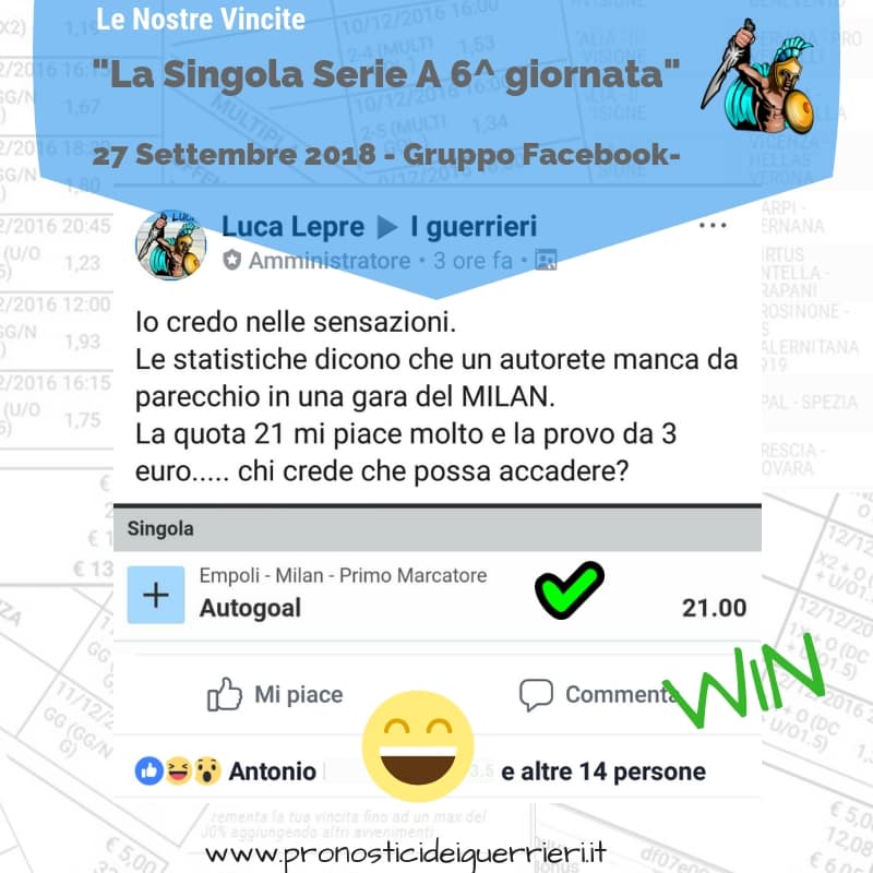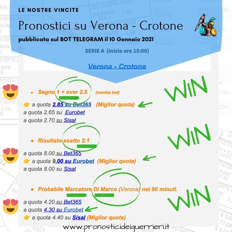 Tutti questi pronostici sono stati condivisi con i membri della nostra Community su questo sito, nel nostro gruppo Facebook, via newsletter o tramite il canale Telegram.