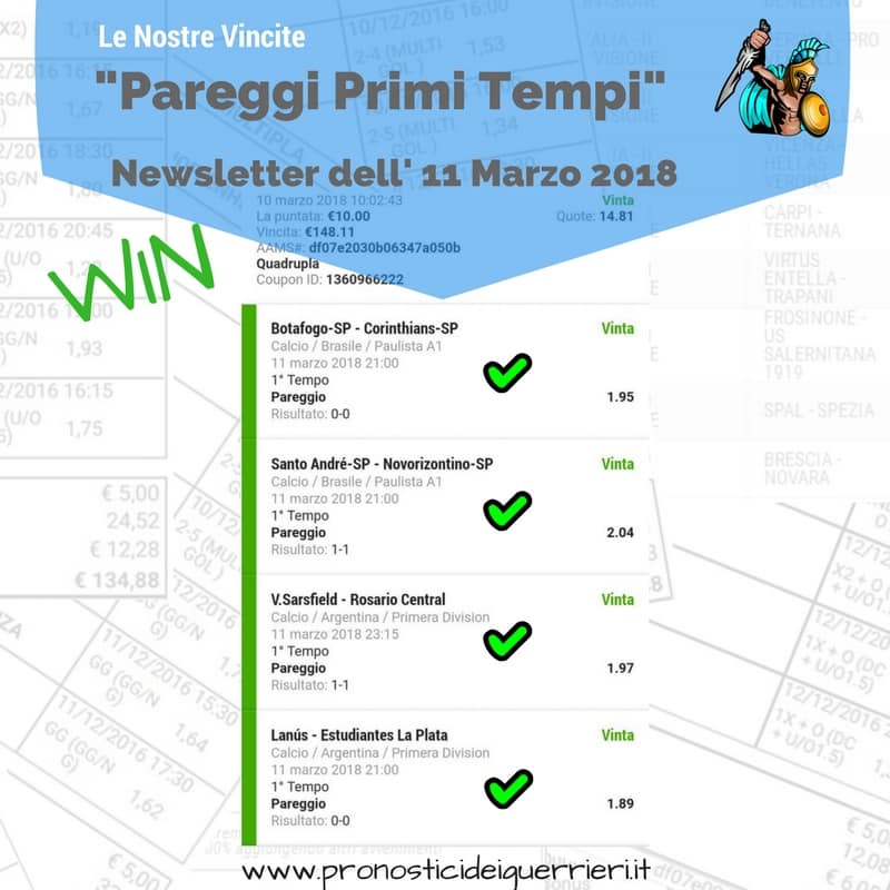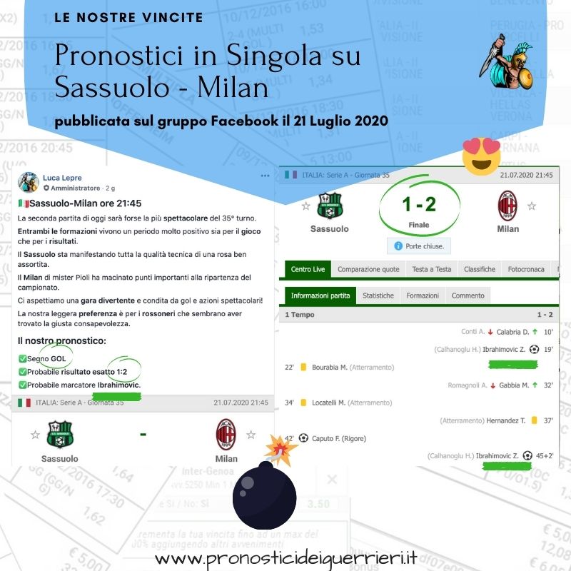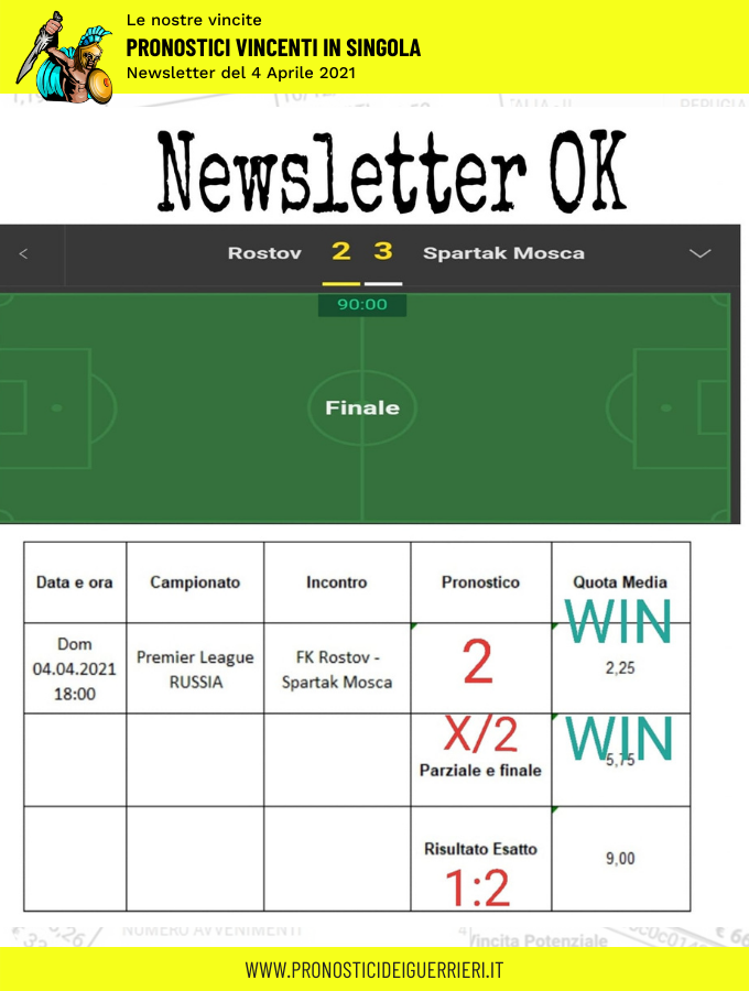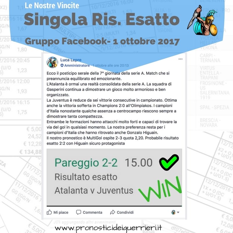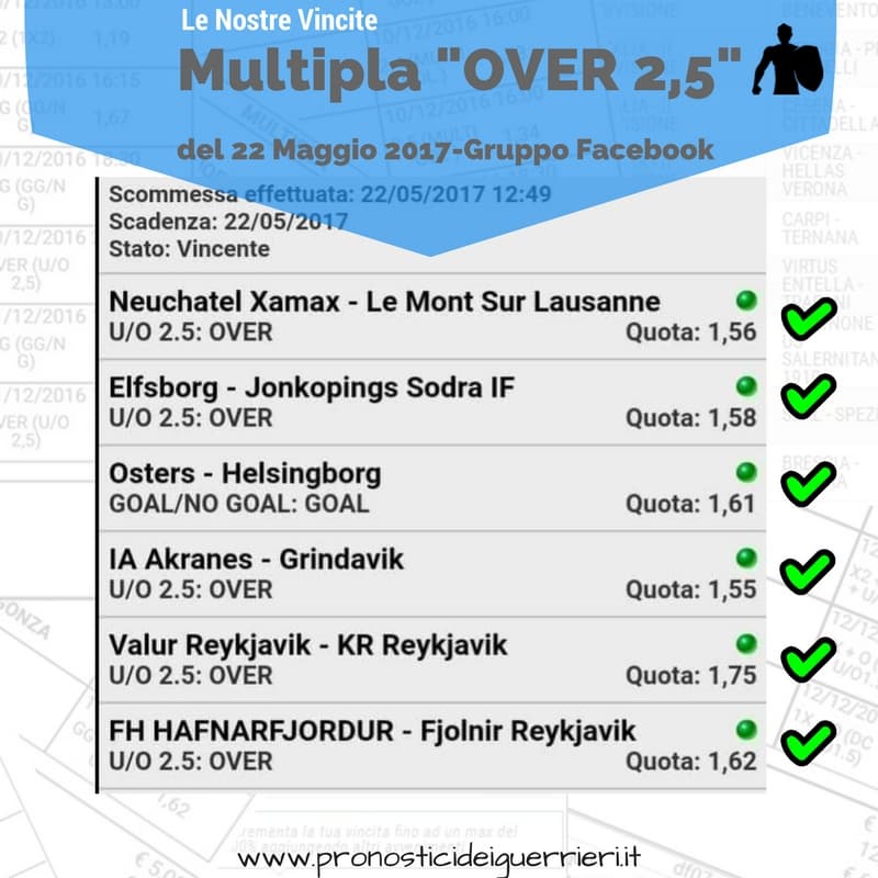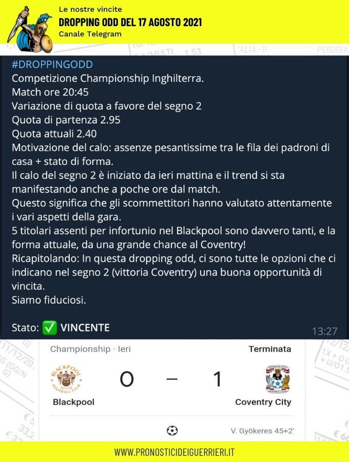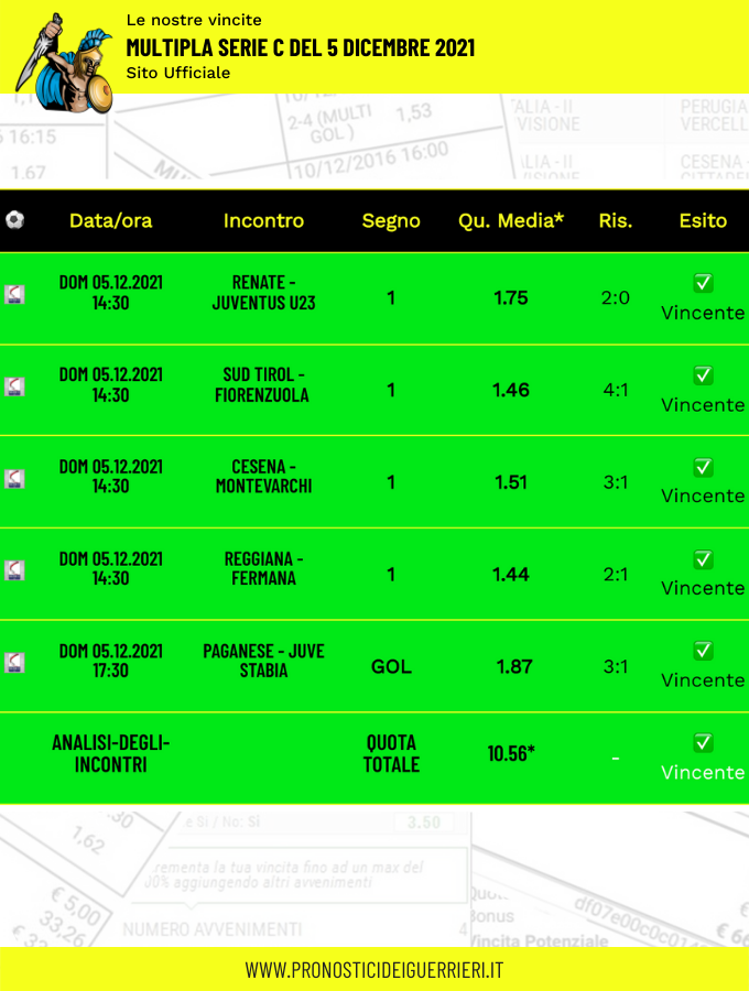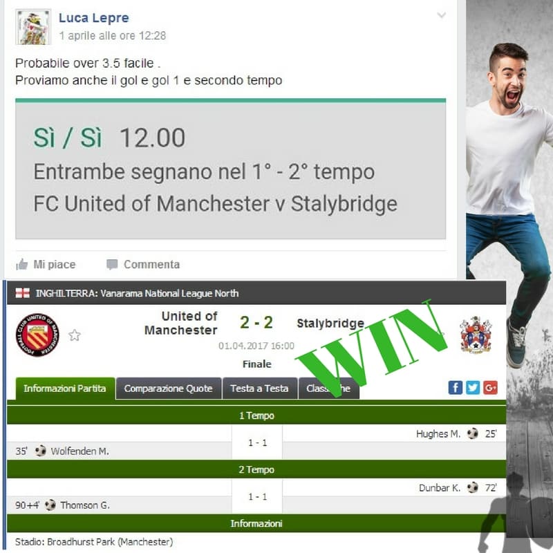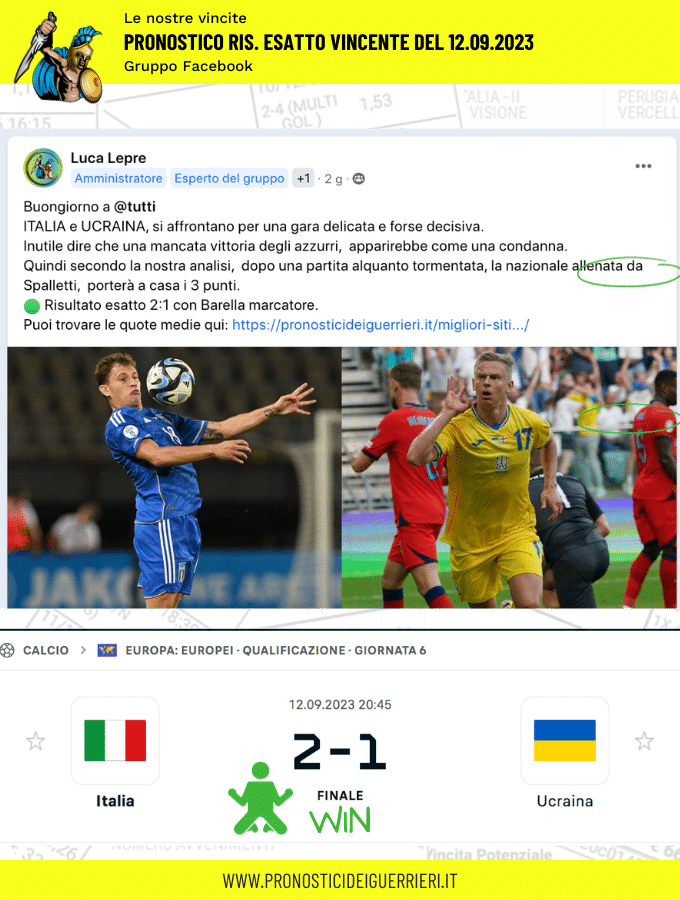 Tutti questi pronostici sono stati condivisi con i membri della nostra Community su questo sito, nel nostro gruppo Facebook, via newsletter o tramite il canale Telegram.