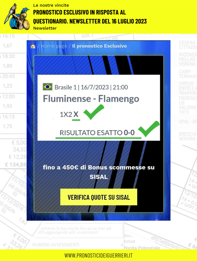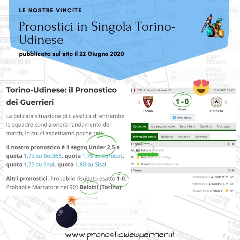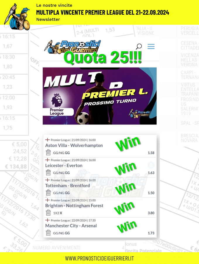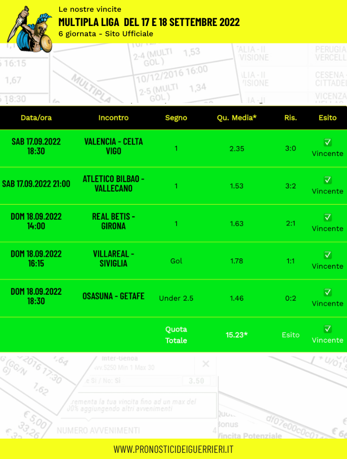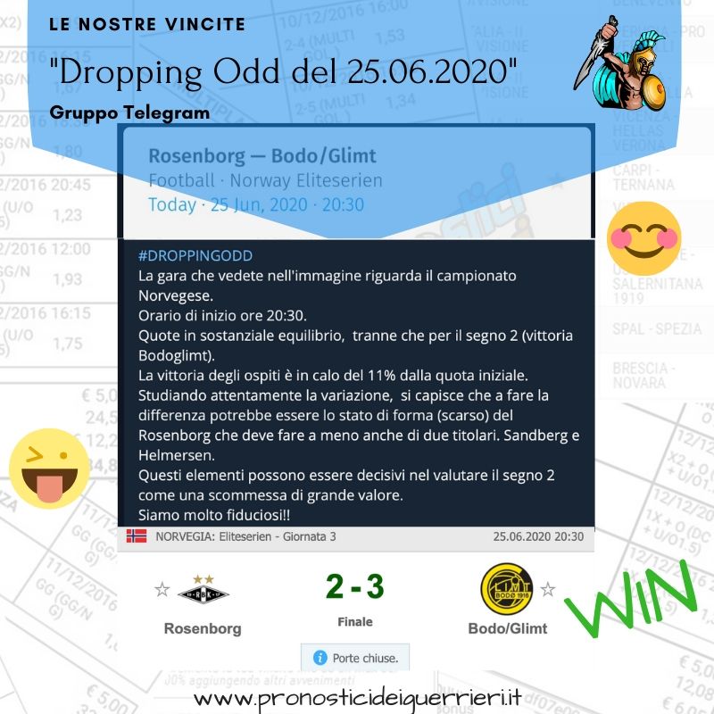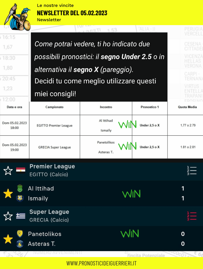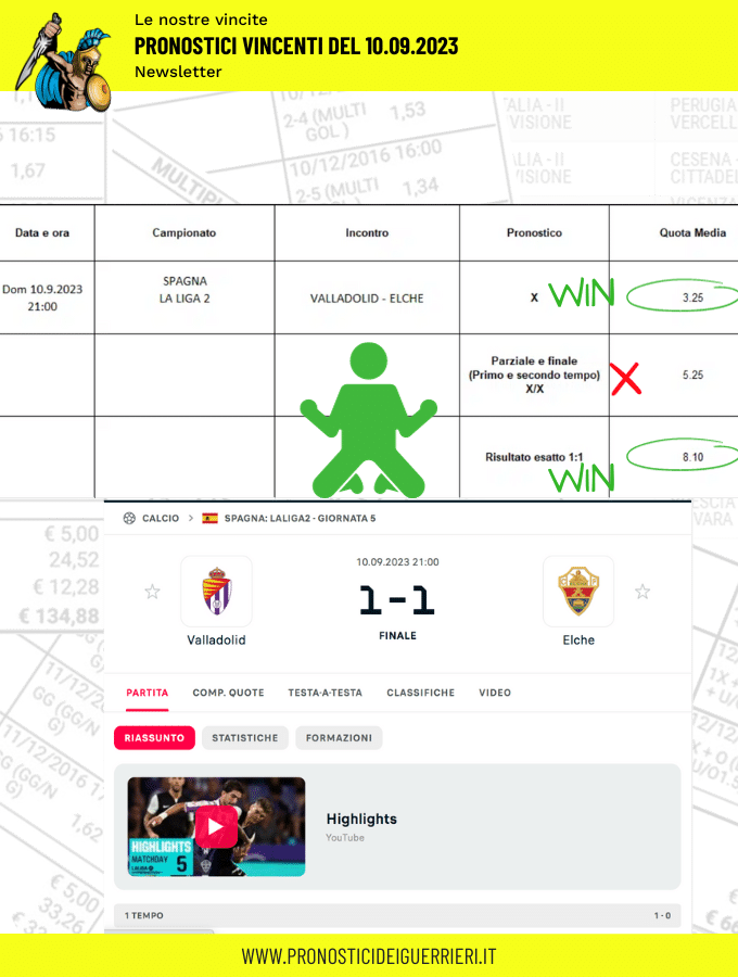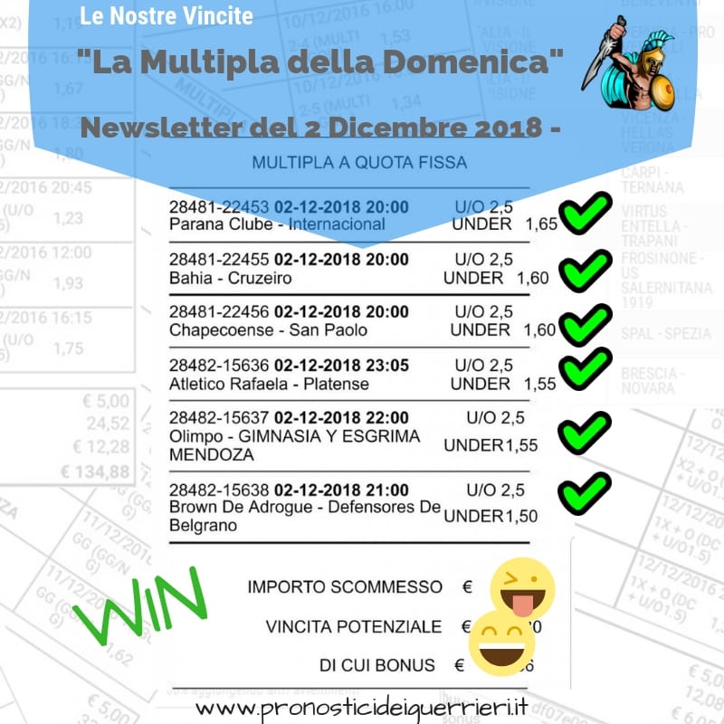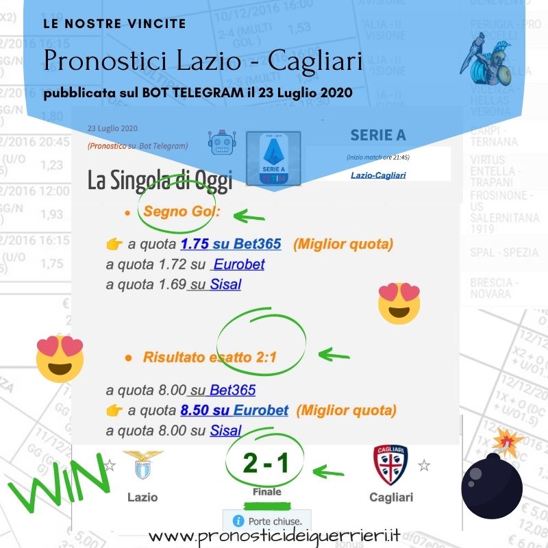Tutti questi pronostici sono stati condivisi con i membri della nostra Community su questo sito, nel nostro gruppo Facebook, via newsletter o tramite il canale Telegram.