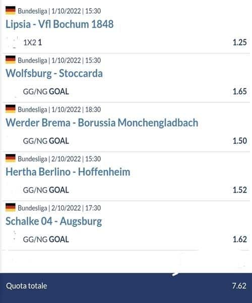 - La Scommessa Multipla della 8^ Giornata di Bundesliga su 5 match che si disputeranno il 1° e 2 ottobre 2022;