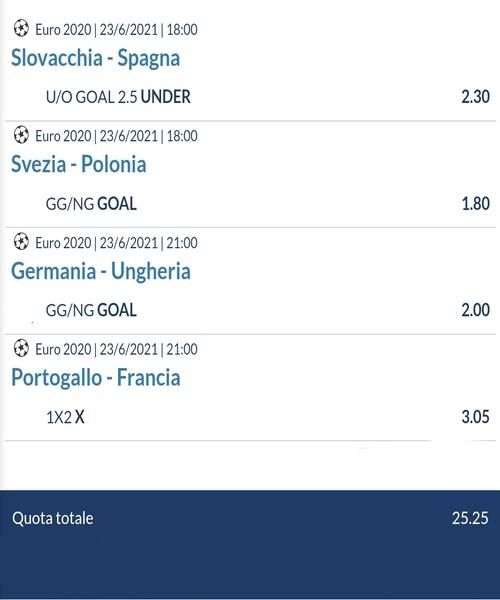 - La Scommessa Multipla della 3^ Giornata della fase a gironi su 4 match che si disputeranno il 23 giugno 2021;