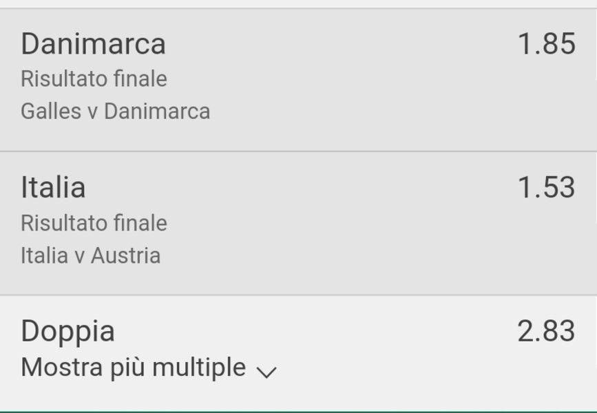 ![]() | Sab 26.06.2021 18:00 | Galles - Danimarca | 2 | 1.83 | 0:4 | ✅ Vincente |