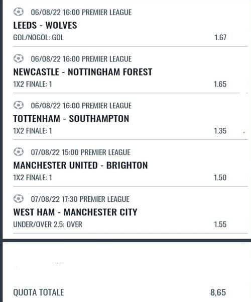 - La Scommessa Multipla della 1^ Giornata della Premier League su 5 match che si disputeranno il 6 e 7 agosto 2022;