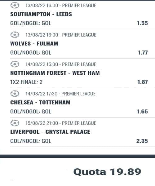 - La Scommessa Multipla della 2^ Giornata della Premier League su 5 match che si disputeranno tra il 13 e 15 agosto 2022;