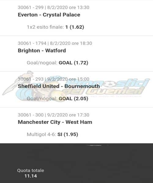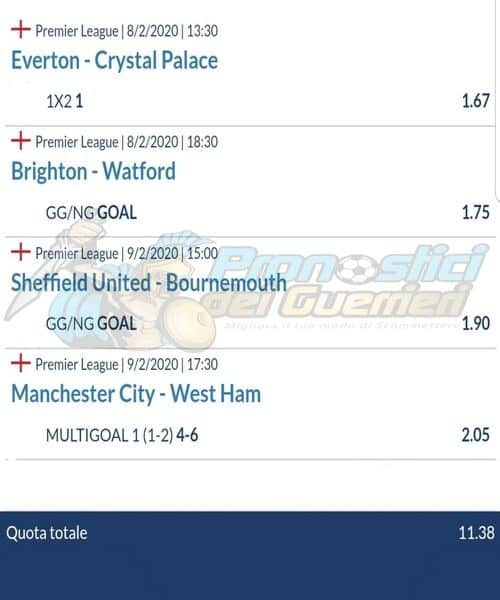 | Dom 09.02.20 17:30 | Manchester City- West Ham | Multigol 4-6 | 2.02 | POSTICIPATA | - |