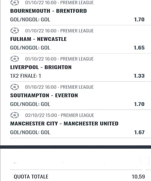 ![]() | Sab 01.10.2022 16:00 | Liverpool - Brighton | 1 | 1.32 | 3-3 | 🆇 Perdente |