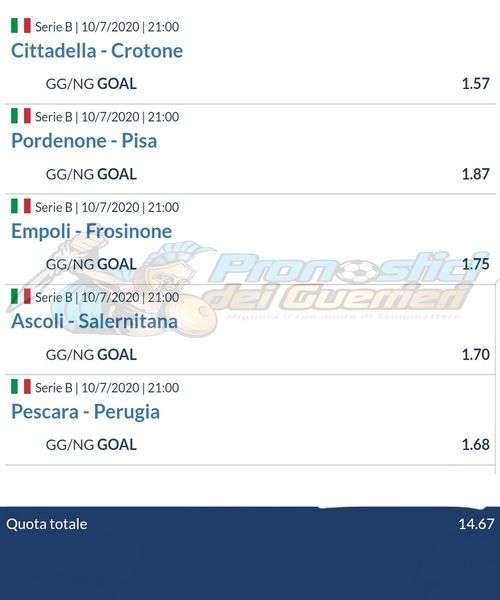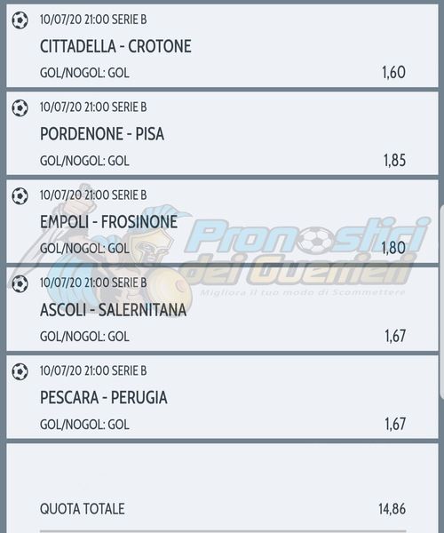 | Ven 10.07.20 21:00 | Pescara - Perugia | Gol | 1.67 | 2:2 | ✅ |
