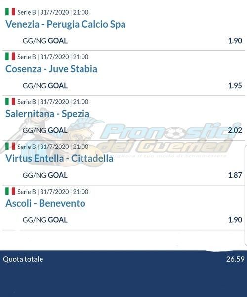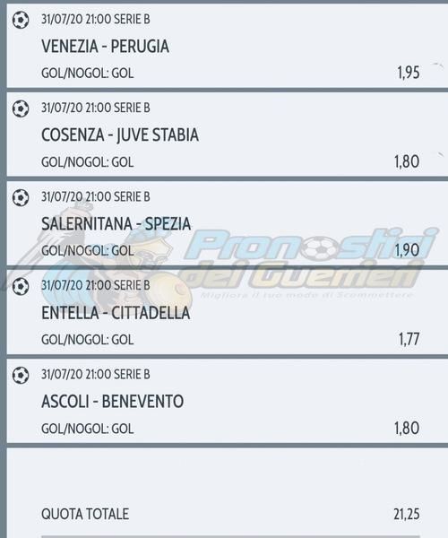 - La Scommessa Multipla della 38^ Giornata della Serie B su 5 match che si disputeranno il 31 luglio 2020;