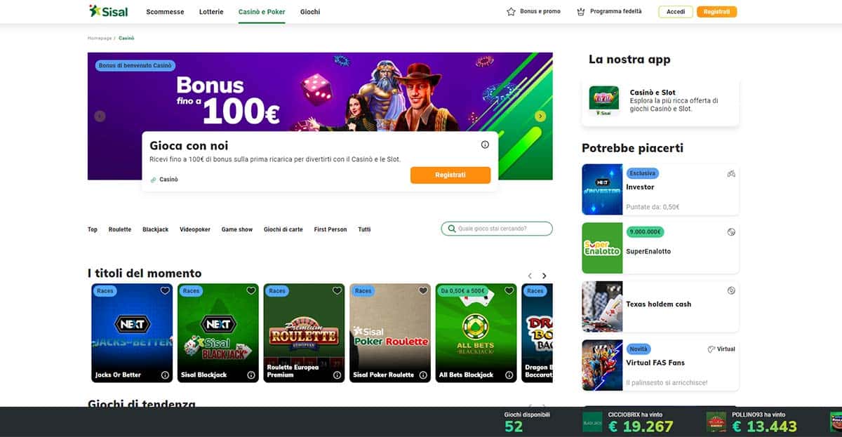 Per chi ama divertirsi con i giochi da casinò e le slot, Sisal offre l’app Casinò e Slot, che dispone anche della sezione giochi live.