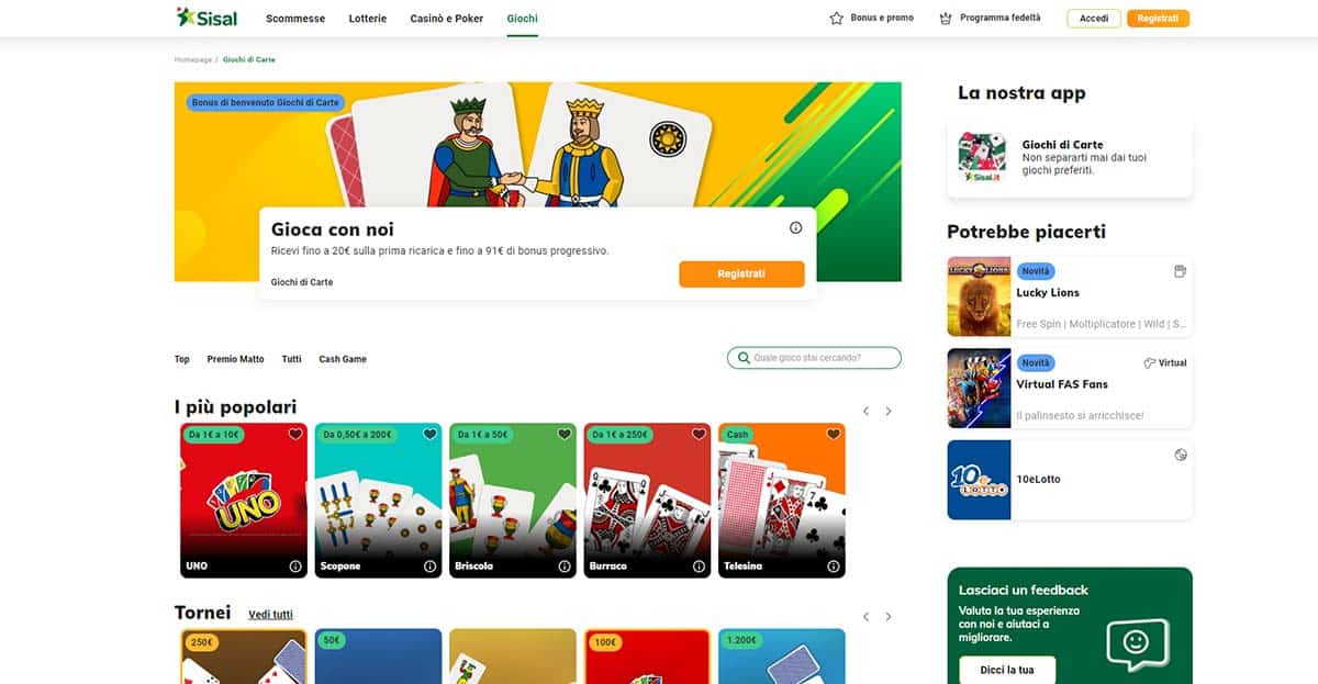 Per quanto riguarda il casinò, Sisal mette a disposizione più di 800 giochi con la possibilità di vedere quelli più utilizzati durante la settimana. In questa sezione si possono trovare anche i giochi da tavolo come la Roulette, il Blackjack, in versione europea e americana e i classici giochi da carte come Briscola, Scala 40, Scopa e tanti altri.
