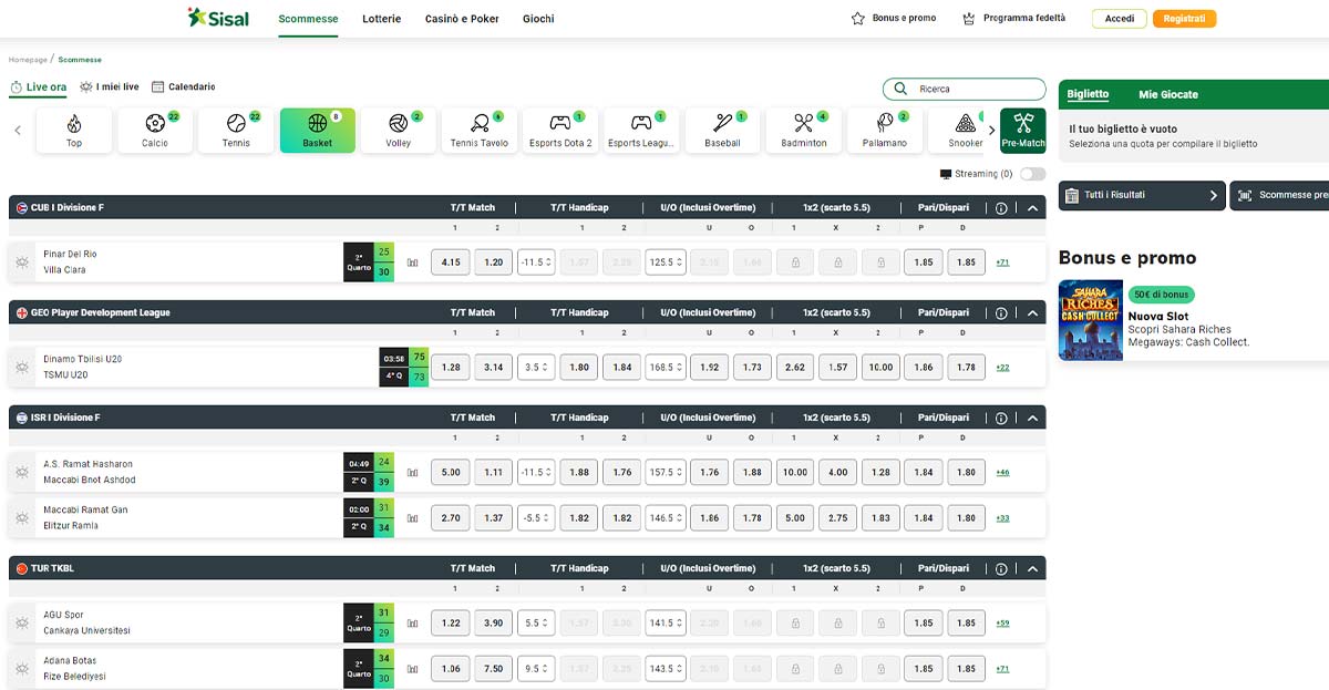 Sisal offre una vasta gamma di scommesse sportive su eventi di calcio, basket, rugby, volley e tanto altro ancora.
