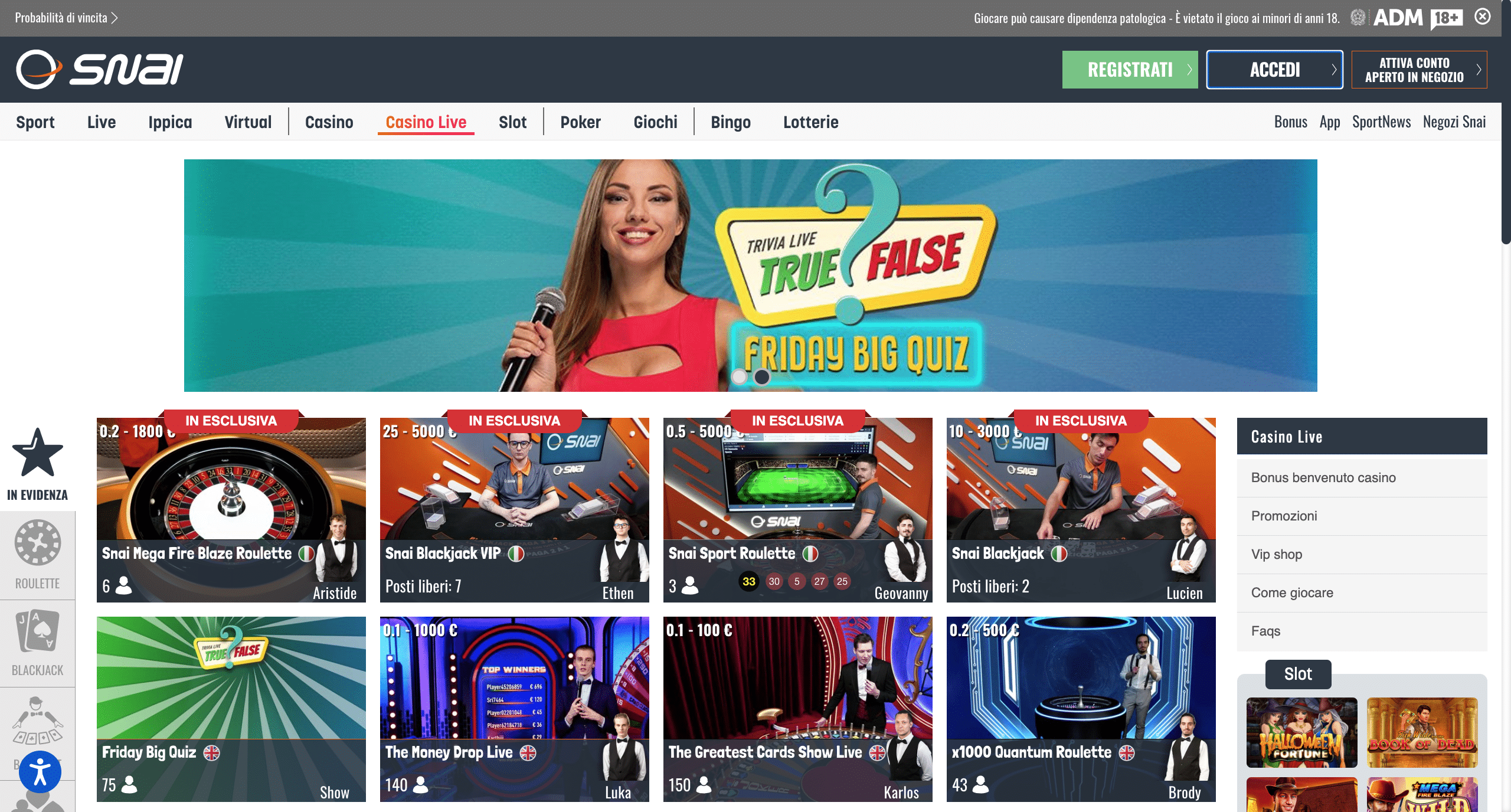 SNAI offre un'ampia scelta di scommesse sportive e giochi online, come slot machine, roulette, blackjack, videopoker e altro ancora.