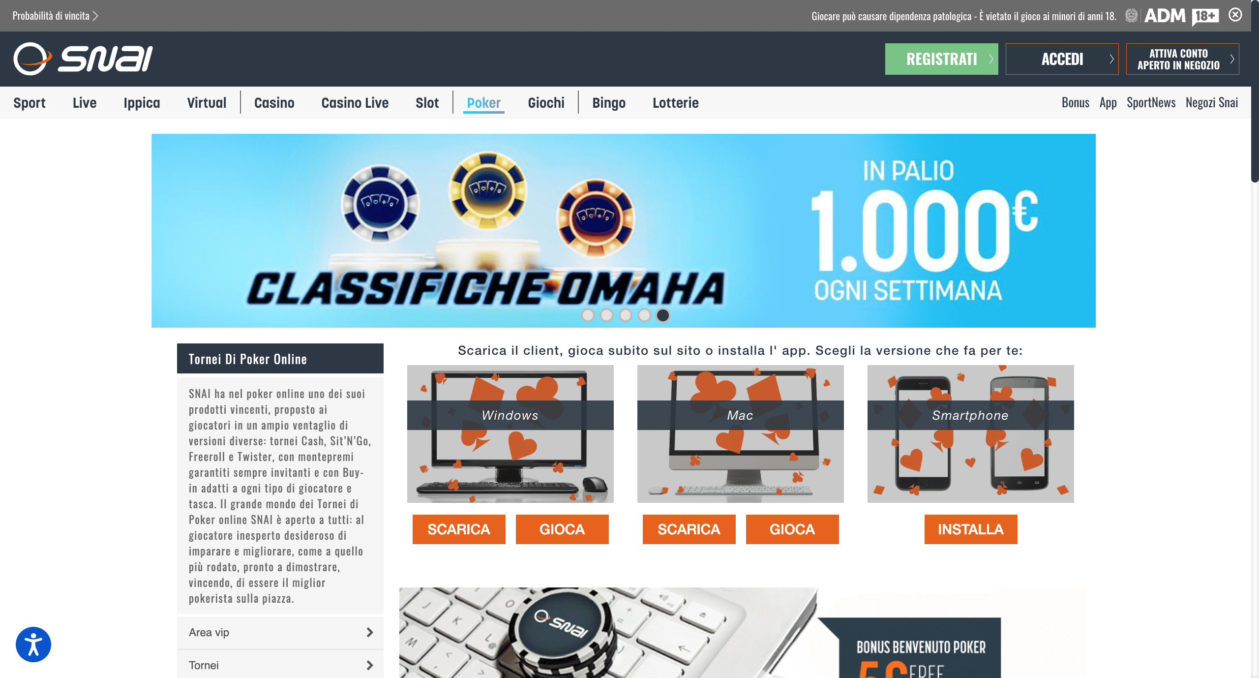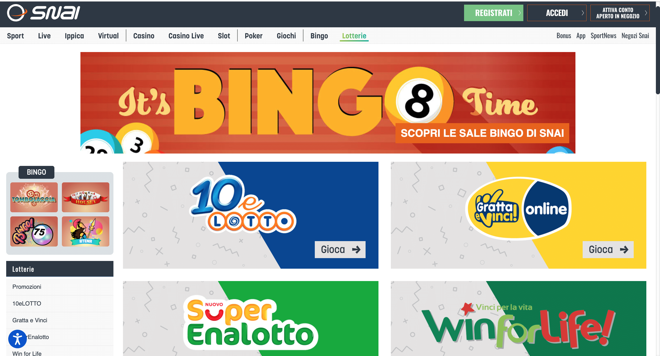 SNAI si distingue per l'ampia offerta di scommesse e giochi, i bonus e le promozioni vantaggiose e un'ottima assistenza clienti.