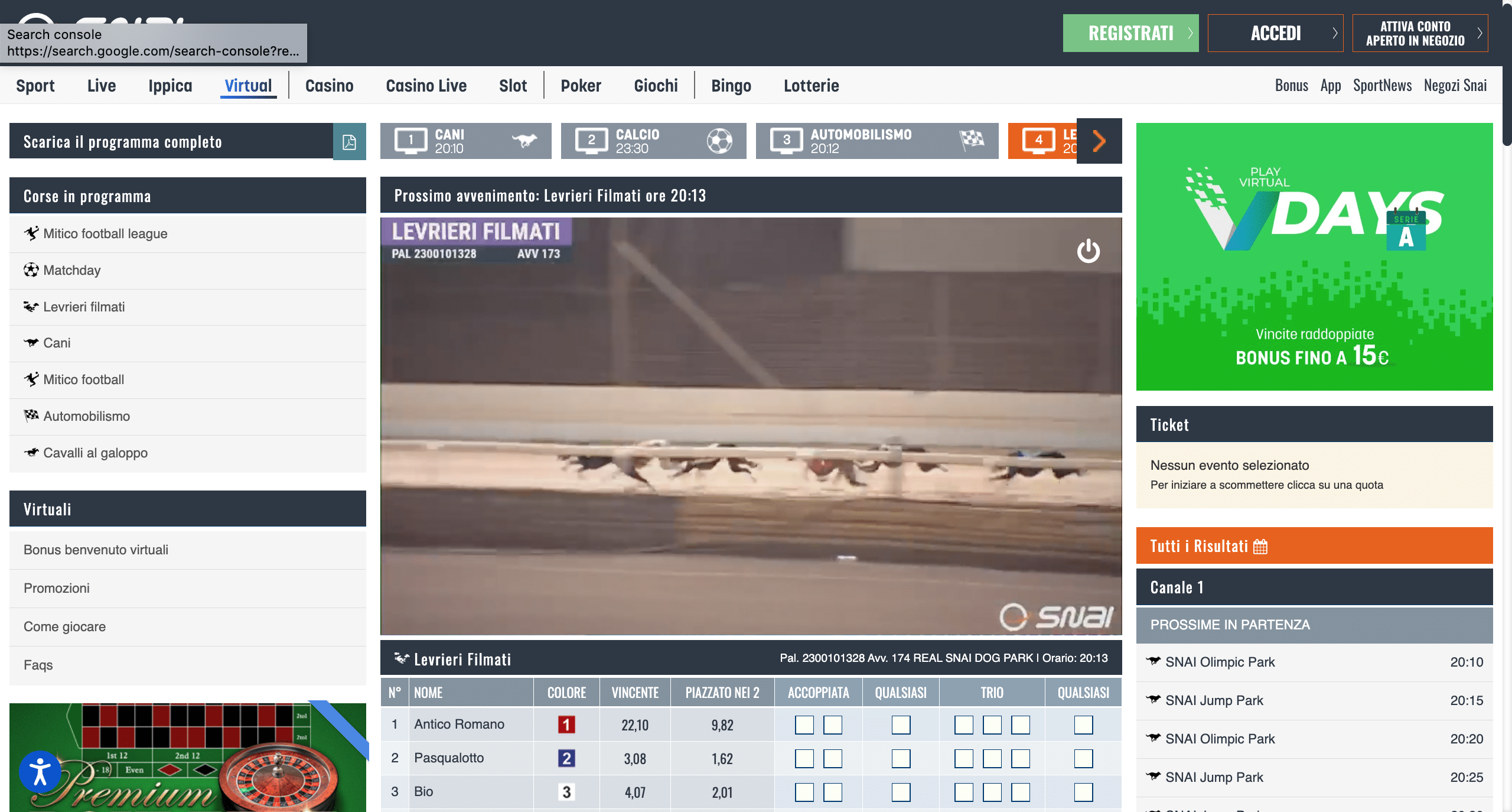 Se invece sei tra coloro che preferiscono le scommesse virtuali, SNAI offre 8 sport virtuali tra cui calcio, cavalli e cani 🙂